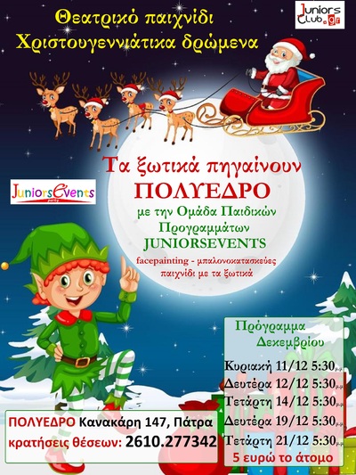 Τα ξωτικά του Άγιου Βασίλη, πηγαίνουν στο Πολύεδρο στην οδό Κανακάρη 147, στην Πάτρα για να υποδεχθούν τους μικρούς μας φίλους και να περάσουν μαζί, μια ώρα γεμάτη Χριστουγεννιάτικα δρώμενα, θεατρικό παιχνίδι, τραγούδια και κάλαντα!