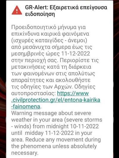 Προειδοποιητικό μήνυμα της Πολιτικής Προστασίας