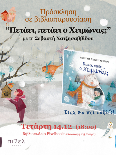 Αυτή την Τετάρτη 14 Δεκεμβρίου 2022, στις 6 το απόγευμα θα παρουσιαστεί στο Πίξελbooks στην οδό Κανακάρη 185, στην Πάτρα, το παιδικό βιβλίο της Σεβαστής Χατζησαββίδου με τίτλο «Πετάει, πετάει …ο χειμώνας;» που κυκλοφορεί από τις εκδόσεις Σιελ.