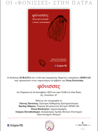 Εκδήλωση παρουσίασης του βιβλίου "Φόνισσες" της Νίνας Κουλετάκη θα πραγματοποιηθεί στην Πάτρα, την Παρασκευή 16 Δεκεμβρίου 2022 και ώρα 19:00 στο Due Piani (Αγίου Νικολάου 47 και Κορίνθου). Την εκδήλωση διοργανώνουν οι Εκδόσεις Κύφαντα & το Κέντρο Διαχείρισης Έμφυλων Ανισοτήτων Εριφύλη (Σαχτούρη 64, Πάτρα, τηλ. 2610 33 46 55).