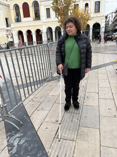 «Στην Πάτρα και την πλατεία υπάρχει ένας οδηγός τυφλών που ονομάζουμε υποτυπώδη γιατί μοιάζει πολύ με το υπόλοιπο δάπεδο της πλατείας και είναι πολύ εύκολο να τον χάσεις και να μπεις μέσα στην πλατεία στην οποία είναι δύσκολο να κινηθεί τυφλός γιατί υπάρχουν πάρα πολλά εμπόδια. Καμιά φορά δεν υπάρχει και κατανόηση. Κάποτε περνώντας από την εθνική τράπεζα τράκαρα με μία κυρία που έμπαινε από τη ράμπα που υπάρχει στην πλατεία. Το μπαστούνι μου μπερδεύτηκε στα πόδια της και άρχισε να φωνάζει. Έλεγε στην ουσία να κλειστώ στο σπίτι μου» θυμάται.