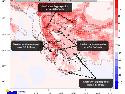 Στον προγνωστικό χάρτη που ακολουθεί αποτυπώνεται η εκτιμώμενη άνοδος των μεγίστων θερμοκρασιών τις μεσημεριανές ώρες, συγκριτικά με τις χθεσινές μέγιστες θερμοκρασίες.