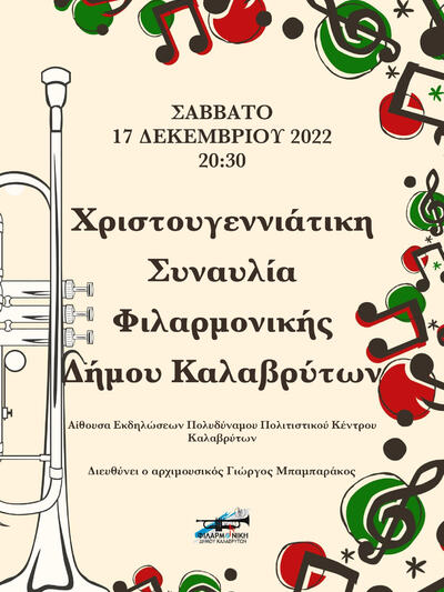 Σε γιορτινούς ρυθμούς καθώς πλησιάζουν τα Χριστούγεννα κινούνται και τα γραφικά Καλάβρυτα, στις πλαγιές του Χελμού. Αυτό το Σάββατο 17 Δεκεμβρίου 2022 στις 20.30 θα δοθεί Χριστουγεννιάτικη συναυλία της Φιλαρμονικής του Δήμου Καλαβρύτων στην αίθουσα εκδηλώσεων του Πολυδύναμου Πολιτιστικού κέντρου της πόλης.