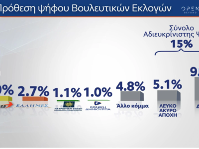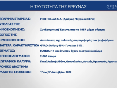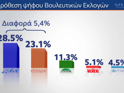 Όλο και περισσότερο φαίνεται ότι μικραίνει η ψαλίδα ανάμεσα σε Νέα Δημοκρατία και ΣΥΡΙΖΑ, σύμφωνα με τις τάσεις της ΜRΒ που παρουσίασε το OPEN την Πέμπτη 15 Δεκεμβρίου. Σύμφωνα με την MRB με τις εκλογές να πλησιάζουν η ΝΔ λαμβάνει το 28,5% στην πρόθεση ψήφου, ενώ ο ΣΥΡΙΖΑ το 23,1%. Τον περασμένο Ιούνιο η διαφορά ανάμεσα σε ΝΔ και ΣΥΡΙΖΑ στην τότε 6μηνιαία μέτρηση βρισκόταν στις 7,2 ποσοστιαίες μονάδες.