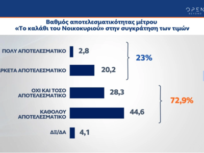 Για το «Καλάθι του νοικοκυριού», το 72,9% των πολιτών κρίνουν ότι το μέτρο δεν είναι ιδιαίτερα αποτελεσματικό ή δεν είναι καθόλου αποτελεσματικό. Από την άλλη πλευρά το 23% των πολιτών σημειώνουν ότι το μέτρο είναι αρκετά ή πολύ αποτελεσματικό. Σύμφωνα με τον αναλυτή, ο κόσμος ακόμα δεν χρησιμοποιεί το «καλάθι του νοικοκυριού» σε βάθος αλλά θεωρεί περισσότερο συμφέρουσες τις εκάστοτε προσφορές των καταστημάτων.