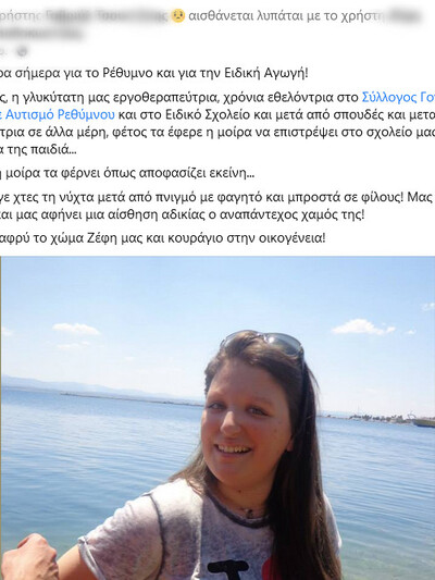 «Μαύρη μέρα σήμερα για το Ρέθυμνο και για την Ειδική Αγωγή! Η Ζέφη μας, η γλυκύτατη μας εργοθεραπεύτρια, χρόνια εθελόντρια στον Σύλλογο Γονέων Ατόμων με Αυτισμό Ρεθύμνου και στο Ειδικό Σχολείο και μετά από σπουδές και μεταπτυχιακά, αναπληρώτρια σε άλλα μέρη, φέτος τα έφερε η μοίρα να επιστρέψει στο σχολείο μας και στα αγαπημένα της παιδιά... κι όμως η μοίρα τα φέρνει όπως αποφασίζει εκείνη... Άδικα έφυγε χτες τη νύχτα μετά από πνιγμό με φαγητό και μπροστά σε φίλους! Μας λυπεί ιδιαίτερα και μας αφήνει μια αίσθηση αδικίας ο αναπάντεχος χαμός της! Ας είναι ελαφρύ το χώμα Ζέφη μας και κουράγιο στην οικογένεια!»