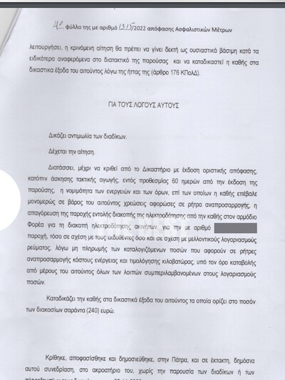 Μια ακόμα αίτηση ασφαλιστικών μέτρων δημοσιεύτηκε στην Πάτρα κατά της ρήτρας αναπροσαρμογής. Το Μονομελές Πρωτοδικείο της Πάτρας, απαγόρευσε προσωρινά μέχρι την τελική κρίση της νομιμότητας της ρήτρας με αγωγή, την διακοπή του ρεύματος για μεγάλο ερασιτεχνικό σωματείο αθλητισμού της Πάτρας.
