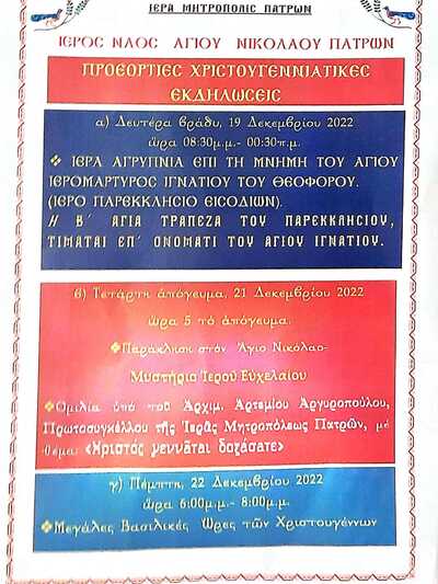 Την Τετάρτη 21/12 στις 5 το απόγευμα θα ψαλεί παράκληση στον άγιο Νικόλαο και θα ακολουθήσει το μυστήριο του ιερού ευχελαίου, στο ναό του Αγίου Νικολάου ενώ κατόπιν έχει προγραμματιστεί ομιλία από τον αρχιμανδρίτη π. Αρτέμιο Αργυρόπουλο, πρωτοσύγκελο της Ιεράς Μητρόπολης Πατρών και ηγούμενο της ιεράς μονής των Αγίων Πάντων στο Βελιμάχι Τριταίας. Το θέμα της ομιλίας του είναι «Χριστός γεννάται δοξάσατε».