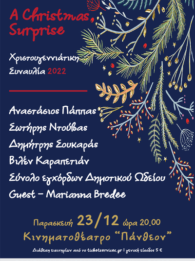 Με τη Χριστουγεννιάτικη συναυλία με τίτλο «Christmas surprise» συνεχίζονται στις 8 το βράδυ την Παρασκευή 23 Δεκεμβρίου 2022, προπαραμονή των Χριστουγέννων στο κινηματοθέατρο «Πάνθεον» στην οδό Γούναρη και Κανακάρη, οι εκδηλώσεις του Πολιτιστικού Οργανισμού του Δήμου Πατρέων για την φετινή εορταστική περίοδο των Χριστουγέννων και της Πρωτοχρονιάς.