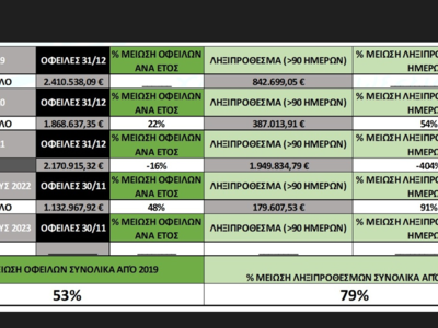 Β. Την 31.12.2019 οι ληξιπρόθεσμές οφειλές διαμορφώθηκαν σε 2.410.538,09 ευρώ, την 31.12.2020 σε 1.868.637,35 ευρώ, την 31.12.2021 σε 2.170.915,32 ευρώ ενώ σήμερα με βάση τα επίσημα στοιχεία της 30/11/2022 το ποσό αυτό ανέρχεται σε μόλις 1.132.967,92 ευρώ με ληξιπρόθεσμα που υπερβαίνουν τις 90 ημέρες και δεν έχουν τακτοποιηθεί από την οικονομική υπηρεσία μόλις 179.607,53 ευρώ. Η μείωση των ληξιπρόθεσμων οφειλών σήμερα σε σχέση με την 31.12.2019 ανέρχεται σε πάνω από 50% γεγονός που αναδεικνύει την προσπάθεια για τακτοποίηση των υποχρεώσεων που γεννούνται από τις δράσεις και τις υποχρεώσεις του φορέα. Παράλληλα εμφανίζεται και η επιτυχής προσπάθεια των υπηρεσιών να ανταποκριθούν στις υποχρεώσεις που γεννούνται εντός των νόμιμων προθεσμιών.