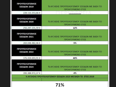 Α. Ο προϋπολογισμός του 2023 είναι συνολικού ύψους, άνω των 390 εκ. ευρώ (390.388.972,37) αυξημένος κατά 13.954.272,46 εκ. ευρώ σε σχέση με το 2022 και κατά 162.278.618,71 ευρώ σε σχέση με το 2019.