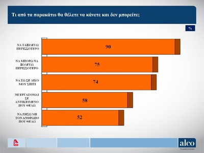 Οι νέοι από 17 έως 34 ετών δηλώνουν παράλληλα ότι θα ήθελαν, αλλά αδυνατούν να ταξιδεύουν περισσότερο, να ξοδεύουν πιο πολλά, να ζουν σε δικό τους σπίτι, να εργάζονται σε αντικείμενο που θέλουν και να ζουν με τον άνθρωπο που αγαπούν.
