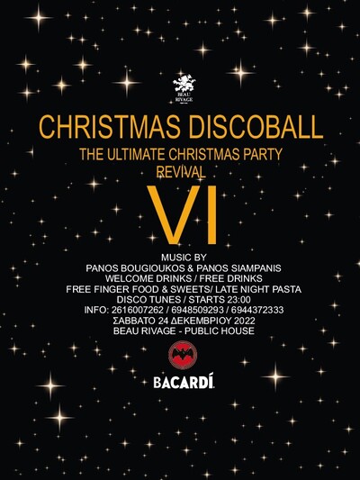 Το Christmas Discoball επιστρέφει και φέτος το Σάββατο 24 Δεκεμβρίου στις 11μ.μ. με την πιο ανανεωμένη και λαμπερή ατμόσφαιρα, προσφέροντας τις καλύτερες disco μουσικές από τους siampanis panos και panos bougioukos και εκλεπτυσμένες γεύσεις σε finger food όσο και την πιο έμπιστη ποιότητα ποτών και κοκτέιλ.