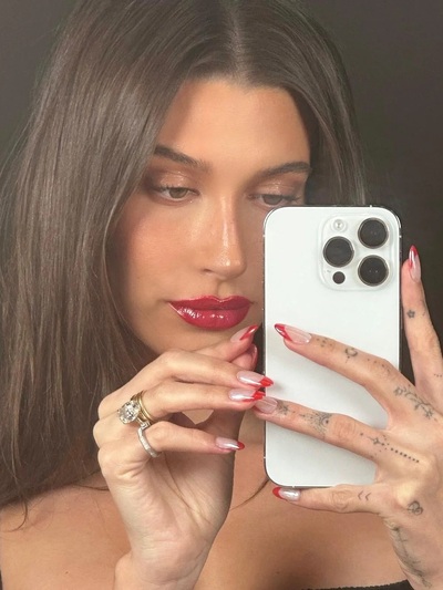 Η Hailey Bieber έκανε το πιο γιορτινό γαλλικό μανικιούρ, με το κόκκινο χρώμα να πρωταγωνιστεί.