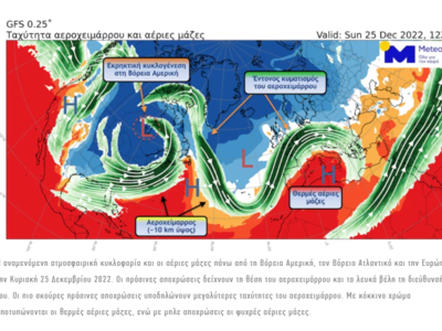Πώς όμως εξηγούνται τα φετινά θερμά Χριστούγεννα; Η ατμοσφαιρική κυκλοφορία πάνω από τη Β. Αμερική κατά τη διάρκεια της Πέμπτης 22/12, «πηδαλιοχούμενη» από τη θέση και ένταση ενός αεροχειμάρρου (ισχυρού ρεύματος αέρα σε ύψος περίπου 10 χιλιομέτρων από την επιφάνεια της Γης), ευνοεί τη μεταφορά πολύ ψυχρών αερίων μαζών, πολικής προέλευσης, από την περιοχή του Καναδά προς τα νοτιότερα γεωγραφικά πλάτη των ΗΠΑ έως τον Κόλπο του Μεξικού.