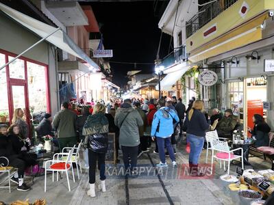 Στο κέντρο των Καλαβρύτων επικρατεί μια γιορτινή ατμόσφαιρα, με τα εμπορικά καταστήματα να είναι ανοικτά όλη την μέρα, ενώ τα μαγαζιά εστίασης να έχουν την τιμητική τους.