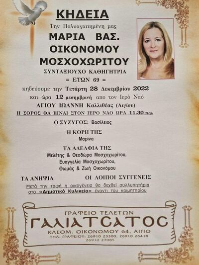 Έφυγε από τη ζωή, χτυπημένη από ανίατη ασθένεια, η συνταξιούχος εκπαιδευτικός Μαρία Μοσχοχωρίτου, σε ηλικία 69 ετών. Η εκλιπούσα είχε μεγάλη προσφορά στην εκπαίδευση όπου ήταν ιδιαίτερα αγαπητή, ενώ παρουσίαζε μεγάλο ενδιαφέρον για την τοπική κοινωνία και τα κοινά, αφού ήταν υποψήφια δημοτική σύμβουλος, τόσο με τον συνδυασμό του τέως δημάρχου Αιγίου Απόστολου Καραφωτιά όσο και με την παράταξη «Αιγιαλέων Πόλις» του Γρηγόρη Τριανταφυλλόπουλου, δύο φορές.
