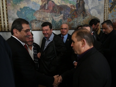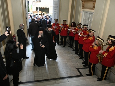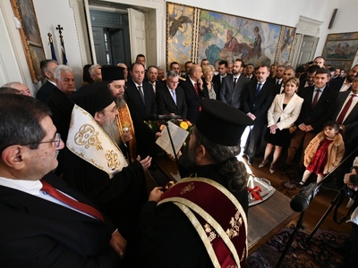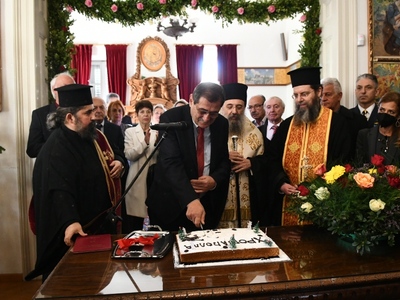 Πριν την εκδήλωση στο Δημαρχείο τα μέλη της Δημοτικής Αρχής με επικεφαλής το Δήμαρχο, παρέστησαν στη δοξολογία για το νέο έτος που έγινε στο Μητροπολιτικό Ναό της Ευαγγελίστριας.