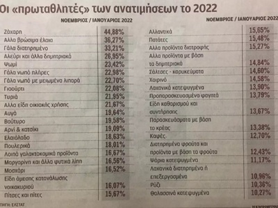 Οι αυξήσεις κυμαίνονται από 3,25% στα οινοπνευματώδη ποτά και φτάνουν το 44,88% στη ζάχαρη. Στα 36 από τα 63 προϊόντα το ποσοστό αύξησης των τιμών του είναι διψήφιο. Σε αυτά συμπεριλαμβάνονται πολύ βασικά είδη διατροφής, όπως τα άλλα βρώσιμα έλαια (σπορέλαια) με αύξηση τιμής κατά 36,27%, το αλεύρι (26,95%), το φρέσκο γάλα (22,98%), το γιαούρτι (22,08%), τα τυριά (21,95%), το ελαιόλαδο (18,63%), οι πατάτες (15,48%).