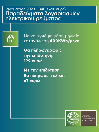 3. Ένα νοικοκυριό με μέση μηνιαία κατανάλωση 1.200 kwh/μήνα θα πλήρωνε 598 ευρώ χωρίς την επιδότηση και τελικά με την επιδότηση θα πληρώσει 255 ευρώ. Ενώ αν εξοικονομήσει και 15% στην κατανάλωση του θα πληρώσει 220 ευρώ.