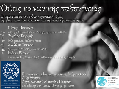 Η Ένωση Αστυνομικών Υπαλλήλων Αχαΐας διοργανώνει την Παρασκευή 13 Ιανουαρίου 2023 και ώρα 18:00 στο αμφιθέατρο του Αρχαιολογικού Μουσείου Πατρών εκδήλωση - ομιλία με θέμα: «Όψεις κοινωνικής παθογένειας. Οι περιπτώσεις της ενδοοικογενειακής βίας, της βίας κατά των γυναικών και της παιδικής κακοποίησης» υπό την αιγίδα της Περιφέρειας Δυτικής Ελλάδας.