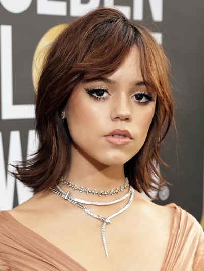 Δεν «τρελαθήκαμε» με το μπεζ σομόν φόρεμά της με τις πλισέ ασυμμετρίες και τα ανοίγματα, έστω κι αν το περιοδικό People την έχρισε Gucci Goddess λόγω αρχαιοπρεπούς style, στο red carpet των Χρυσών Σφαιρών. Συμφωνούμε όμως πως το beauty look της ήταν ένα από τα πιο επίκαιρα και μοντέρνα! Η 20χρονη ηθοποιός Τζένα Ορτέγκα με τις μεξικάνικες ρίζες, που εξελίχθηκε σε super star του Netflix χάρη στη δημοφιλή σειρά «Wednesday» και έγινε η πρώτη λατίνα που προτάθηκε για τηλεοπτικό, πρωταγωνιστικό βραβείο σε τόσο νεαρή ηλικία, ήταν χτενισμένη και μακιγιαρισμένη υπέροχα. Με μαλλιά μεσαίου μήκους, κομμένα «ντεγκραντέ», σε «μύτες», στον πολύ περιζήτητο τελευταία τόνο της καραμέλας, υπάκουσε στο hairstylist David Stanwell, που χρησιμοποίησε προιόντα Fekkai. Είχε πολύ τονισμένα μάτια, με διπλό, super trendy eyeliner που λέγεται «double wing» και πολύ έντονες βλεφαρίδες. Η σκιά ήταν άτονη σε εκρού περλέ και το κραγιόν ροδακινί, ώστε το πρόσωπο να εναρμονίζεται χρωματικά με το ρούχο της. Το look φρόντισε ο makeup artist Vincent Oquendo. Εντύπωση έκαναν και οι rock-goth επιλογές των κολιέ, από λευκόχρυσο και ασήμι με την υπογραφή του διάσημου οίκου Tiffany & Co. Το layering απέφερε ένα αποτέλεσμα πολύ νεανικό.