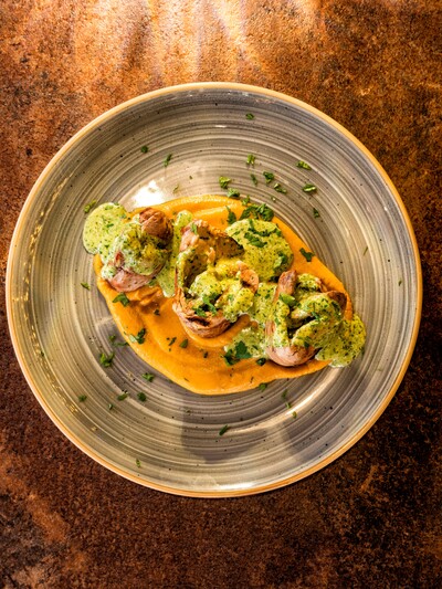 Δοκιμάσαμε ψαρονέφρι γεμιστό με λιαστή ντομάτα, γραβιέρα Νάξου και θυμάρι, συνοδευμένο από πουρέ καρότου με σάλτσα πέστο ρόκας