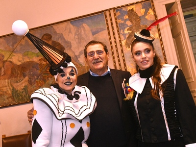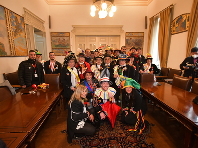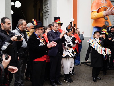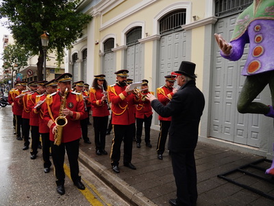 Στην είσοδο του Δημαρχιακού Μεγάρου τους περίμενε ο Δήμαρχος Πατρέων Κώστας Πελετίδης, μέσω των παιανισμών της Δημοτικής Μουσικής του Πολιτιστικού Οργανισμού που υπό την καθοδήγηση του μαέστρου Χρήστου Λούκα έπαιζε γνωστά καρναβαλικά τραγούδια και αποκριάτικους σκοπούς. Ο καθηγητής του Δημοτικού Ωδείου Περικλής Αλιώπης με την τρομπέτα του έπαιζε από το μπαλκόνι του Δημαρχείου.