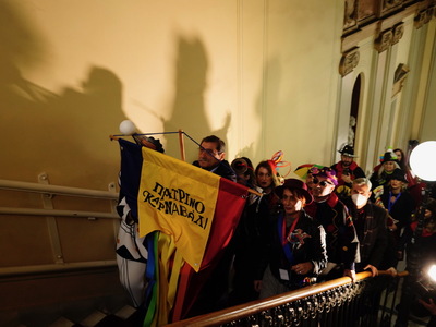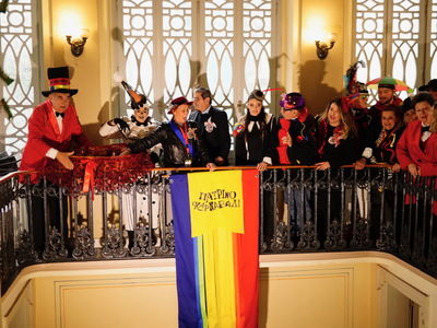 Μέσα σε χαρούμενο καρναβαλικό κλίμα όπου οι ευχές και τα χαμόγελα έδιναν και έπαιρναν και μετά από μια μικρή παρουσίαση του καλλιτεχνικού δρώμενο των Rising Flames, η Πρόεδρος της ΚΕΔΗΠ-Καρναβάλι Πάτρας Ήρα Κουρή παρέδωσε το καρναβαλικό λάβαρο στον Δήμαρχο Πατρέων και ακολούθησε η ανάρτησή του στο Δημαρχείο και οι σοκολατορίψεις από το εσωτερικό και εξωτερικό μπαλκόνι του Δημαρχείου.