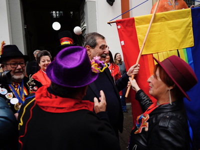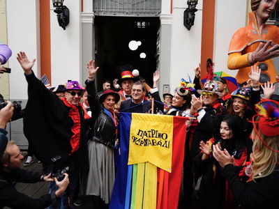 Η καρναβαλική πομπή που μετέφερε το λάβαρο του Πατρινού Καρναβαλιού 2023 έφθασε στο Δημαρχείο της Πάτρας όπου την καλωσόρισε ο Δήμαρχος Πατρέων που, υπό τους αποκριάτικους παιανισμούς της Δημοτικής Μουσικής, παρέλαβει το καρναβαλικό λάβαρο από την πρόεδρο της ΚΕΔΗΠ-Καρναβάλι Πάτρας Ήρα Κουρή. Την εκδήλωση σφράγισε το καθιερωμένο έθιμο του σοκολατοπόλεμου προσφέροντας τη δική του γλυκιά πινελιά.
