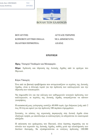 Ο Αχαιός βουλευτής το είχε ζητήσει στις 20.9.2022, με ερώτηση στη Βουλή
