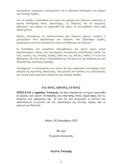 Υπενθυμίζεται ότι ο Αχαιός βουλευτής της ΝΔ Άγγελος Τσιγκρής, στις 20.9.2022 είχε καταθέσει Ερώτηση προς τον Υπουργό Υποδομών και Μεταφορών, στην οποία ρωτούσε: α) πότε αναμένεται να υλοποιηθεί η μελέτη επέκτασης της διώρυγας και β) πότε θα έχει περατωθεί το σύνολο των απαιτούμενων ενεργειών για τη πλήρη λειτουργία του έργου και την υδροδότηση της Δυτικής Αχαΐας.