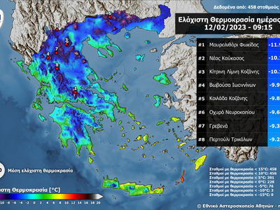 Σύμφωνα με το δίκτυο των αυτόματων μετεωρολογικών σταθμών του Εθνικού Αστεροσκοπείου Αθηνών / Meteo.gr, οι ελάχιστες θερμοκρασίες σήμερα το πρωί στα ηπειρωτικά κυμάνθηκαν σε χαμηλά επίπεδα, με τη χαμηλότερη ελάχιστη θερμοκρασία να σημειώνεται στο Μαυρολιθάρι Φωκίδας με -11,9 βαθμούς Κελσίου.