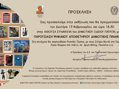 Τα αποκαλυπτήρια του Ψηφιακού Αποθετηρίου της Δημοτικής Πινακοθήκης Πατρών, θα πραγματοποιηθούν στις 6.30 το απόγευμα της Δευτέρας 13 Φεβρουαρίου στο χώρο του Δημοτικού Ωδείου (Αράτου 10).