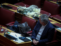 Με ενός λεπτού σιγή η Ολομέλεια της Βουλής τίμησε τη μνήμη του βουλευτή Δωδεκανήσου του ΣΥΡΙΖΑ Νεκτάριου Σαντορινιούμ ενώλ λουλο'υδια υπάρχουν στο έδρανό του στη Βουλή.