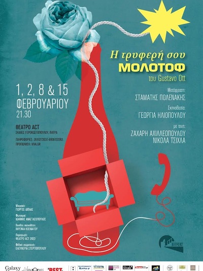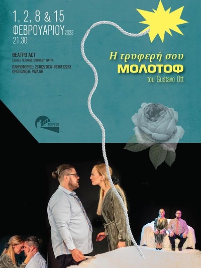 Η τελευταία παράσταση του έργου «Η τρυφερή σου μολότοφ» του Gustavo Ott θα δοθεί την Τετάρτη 15 Φεβρουαρίου 2023 στις 21.30 στο Θέατρο act, στο πάνω μέρος στις σκάλες Γεροκωστοπούλου 65, στην Πάτρα.