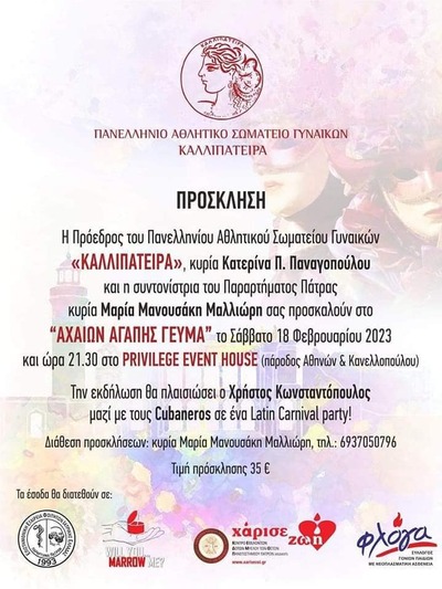 Το Σάββατο, 18 Φεβρουαρίου, θα πραγματοποιηθεί η εκδήλωση «Αχαιών Αγάπης Γεύμα», του Πανελληνίου Αθλητικού Σωματείου Γυναικών «Καλλιπάτειρα», του παραρτήματος Πάτρας, στην αίθουσα Privilege Event House Patras. Συμμετέχουν μουσικά ο Χρήστος Κωνσταντόπουλος μαζί με τους Cubaneros the Band για να παίξουν αγαπημένα τραγούδια με διάθεση καρναβαλική και όχι μόνο, την πιο φωτεινή περίοδο της πόλη.