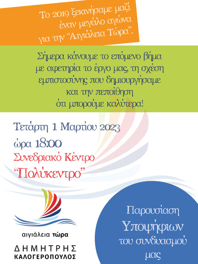 Σας προσκαλώ την Τετάρτη 1 Μαρτίου στις 6 το απόγευμα στο "Πολύκεντρο" συνεδριακό κέντρο στη συνάντηση που θα παρουσιαστούν υποψήφιοι του συνδυασμού μας.