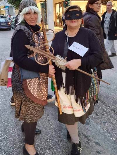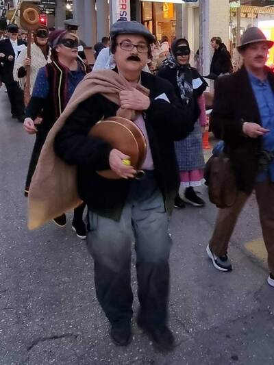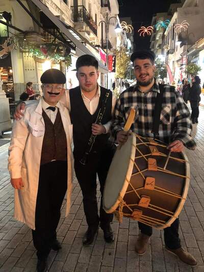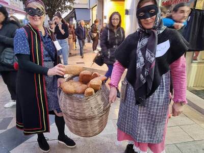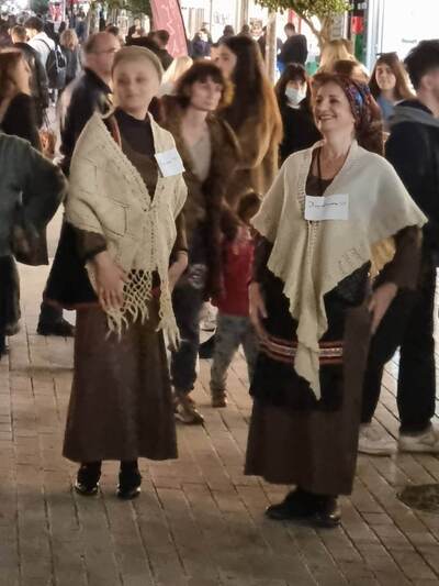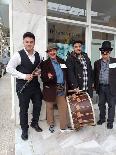 Με το κλαρίνο του Χρήστου Λουκόπουλου και το νταούλι του Αλέξανδρου Ασημακόπουλου, χορεύοντας παραδοσιακό <γαϊτανάκι> και παρουσιάζοντας το δρώμενο της < άμοιρης> ξεσήκωσαν το κέντρο της πόλης κάνοντας τους θαμώνες των καφέ να σηκωθούν και να χορεύουν μαζί μας.