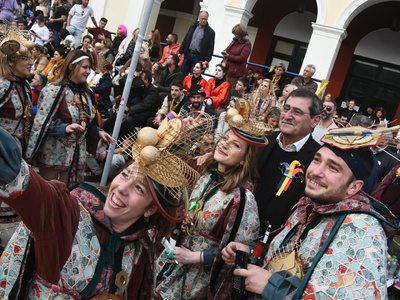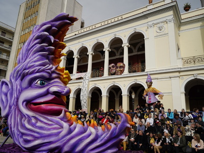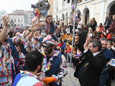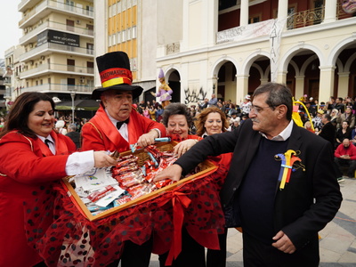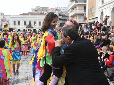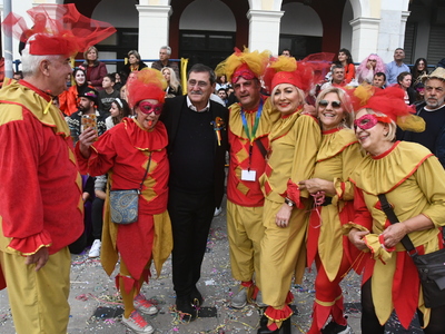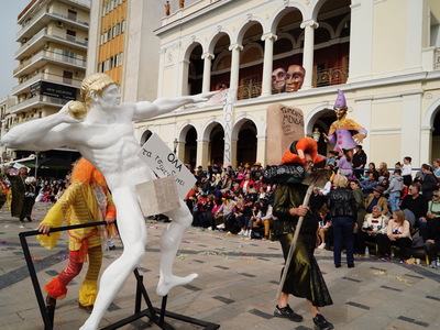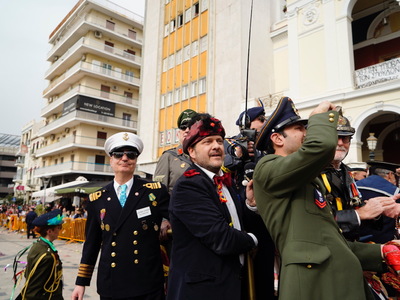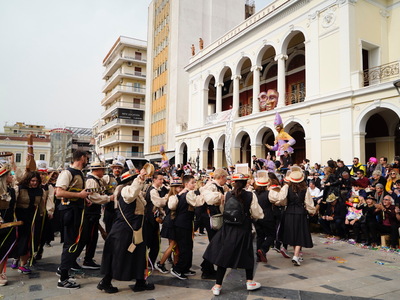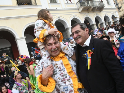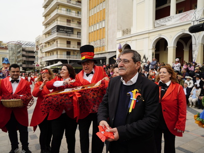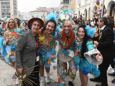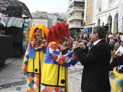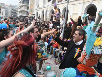 Ο Δήμαρχος Πατρέων Κώστας Πελετίδης μπροστά από το Δημοτικό Θέατρο «Απόλλων» όρθιος υποδεχόταν και συνέχαιρε με θέρμη τους καρναβαλιστές για την εντυπωσιακή παρουσία τους και τη νεολαία της Πάτρας και όλης της Ελλάδας, την πρωταγωνίστρια του Καρναβαλιού μας που ξέρει να στέκεται όρθια, να χαίρεται και να δημιουργεί.