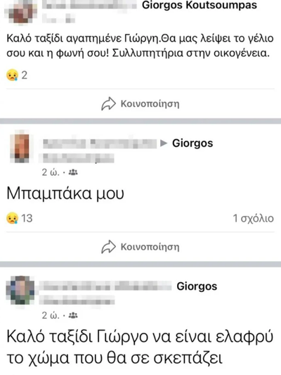 Το δικό τους αποχαιρετιστήριο μήνυμα αφήνουν γνωστοί και φίλοι στον τοίχο του άτυχου άνδρα στο Facebook, μην μπορώντας να πιστέψουν την τραγωδία των Τεμπών.