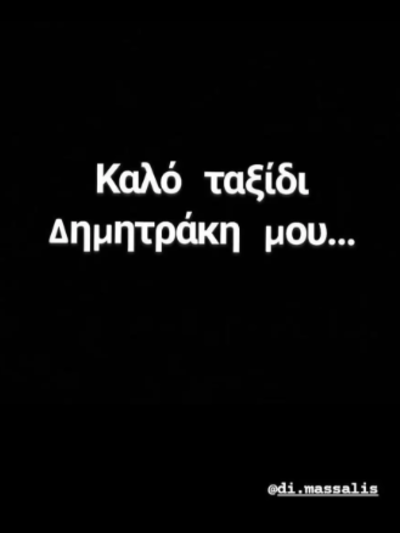 Ακόμη έχει αναρτήσει δύο stories σε μαύρο φόντο. Στο πρώτο έχει την 1η Μαρτίου 2023 - ημέρα του πολύνεκρου σιδηροδρομικού δυστυχήματος - και στο δεύτερο γράφει «Καλό ταξίδι Δημητράκη μου...»