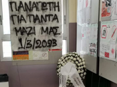 Στην είσοδο του σχολείου τους άναψαν κεριά και άφησαν λουλούδια και ένα στεφάνι, ενώ σε έναν τοίχο τοποθέτησαν σημειώματα στη μνήμη του. Παράλληλα έφτιαξαν και ένα πανό το οποίο γράφει «Παναγιώτη για πάντα μαζί μας 1/3/2023» και τήρησαν ενός λεπτού σιγή στη μνήμη του.