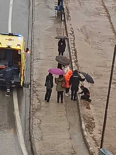 Σύμφωνα με όσα είδαν το φως της δημοσιότητας, επειδή έβρεχε και μέχρι να φθάσει το ασθενοφόρο, ένας Αστυνομικός κρατούσε μία ομπρέλα ώστε να μην βρέχεται.