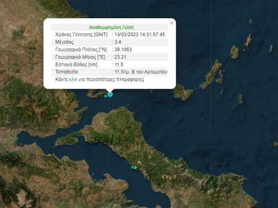 Ο σεισμός των 3,4 βαθμών της κλίμακας Ρίχτερ έχει επίκεντρο τον θαλάσσιο χώρο νότια της Μαγνησίας και σε απόσταση 11 χιλιομέτρων βόρεια του Αρτεμισίου της βόρειας Εύβοιας.