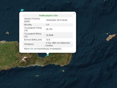 Σεισμός 3,6 Ρίχτερ σημειώθηκε γύρω στις 21:30 της Πέμπτης (16.3.2023) στην Κρήτη και συγκεκριμένα κοντά στην Ιεράπετρα.