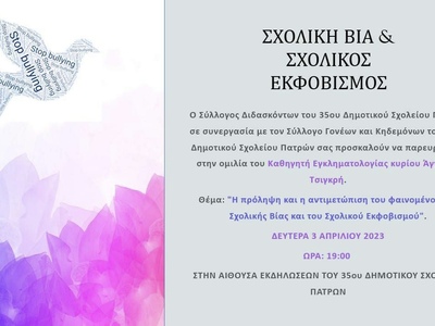 H ομιλία θα γίνει τη Δευτέρα 3 Απριλίου, στις 7 μμ, με θέμα την πρόληψη της σχολικής βίας και του εκφοβισμού. Όπως αναφέρει η ανακοίνωση από το γραφείο του κ. Τσιγκρή: "Η εκδήλωση διοργανώνεται με πρωτοβουλία του Συλλόγου των Εκπαιδευτικών και του Συλλόγου Γονέων και Κηδεμόνων.