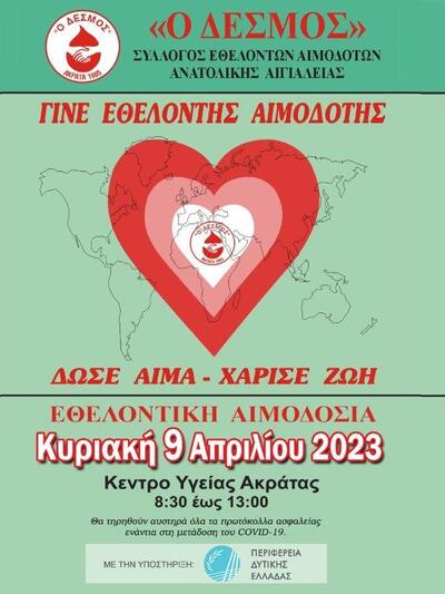Ο Σύλλογος Εθελοντών Αιμοδοτών Ανατολικής Αιγιαλείας «Ο Δεσμός» διοργανώνει εθελοντική αιμοδοσία, την Κυριακή των Βαΐων 9 Απριλίου 2023 και τις ώρες 8.30 π.μ. – 1.00 μ.μ. στο Κέντρο Υγείας Ακράτας.