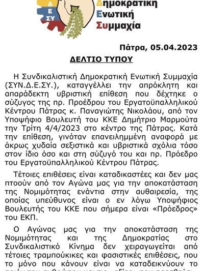 Η Συνδικαλιστική Δημοκρατική Ενωτική Συμμαχία (ΣΥΝ.Δ.Ε.ΣΥ.), καταγγέλλει την απρόκλητη και απαράδεκτη υβριστική επίθεση που δέχτηκε ο σύζυγος της πρ. Προέδρου του Εργατοϋπαλληλικού Κέντρου Πάτρας κ. Παναγιώτης Νικολάου, από τον Υποψήφιο Βουλευτή του ΚΚΕ Δημήτριο Μαρμούτα την Τρίτη 4/4/2023 στο κέντρο της Πάτρας. Κατά την επίθεση, γινόταν επανειλημμένη αναφορά με άκρως χυδαία σεξιστικά και υβριστικά σχόλια τόσο στον ίδιο όσο και στη σύζυγό του και πρ. Πρόεδρο του Εργατοϋπαλληλικού Κέντρου Πάτρας.