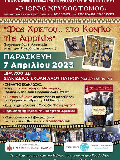 Το Πανελλήνιο Σωματείο Ορθοδόξου Ιεραποστολής «Ο Ιερός Χρυσόστομος» που εδρεύει στην οδό Κορίνθου 449 και Καποδιστρίου στην Πάτρα σε συνεργασία με την Περιφέρεια Δυτικής Ελλάδας, διοργανώνει εκδήλωση – Ημερίδα φιλανθρωπικού χαρακτήρα με τίτλο «Φως Χριστού… στο Κονγκό της Αφρικής» με σκοπό να συμβάλλει στην προώθηση και ανάδειξη του Ελληνορθόδοξου πολιτισμού στο εξωτερικό και ειδικότερα στην Αφρική μέσω του τεράστιου Ιεραποστολικού έργου που επιτελείται στην περιοχή αυτή.